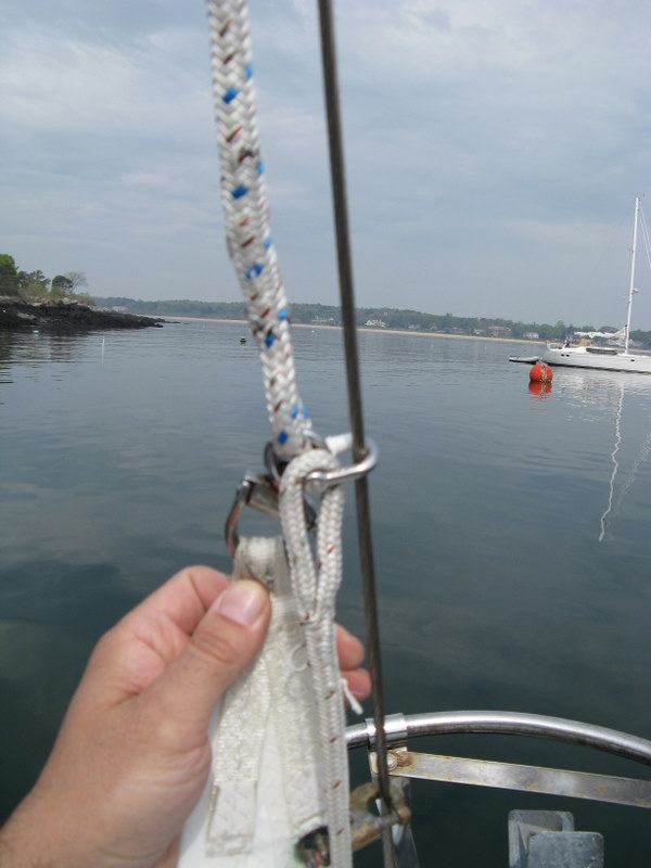 When I first installed the downhaul, I tied it off at the mast near the jib halyard. This required going to the mast and using two hands to douse the jib. And on a CD25 there is not enough room near the mast for two, especially in rough weather.