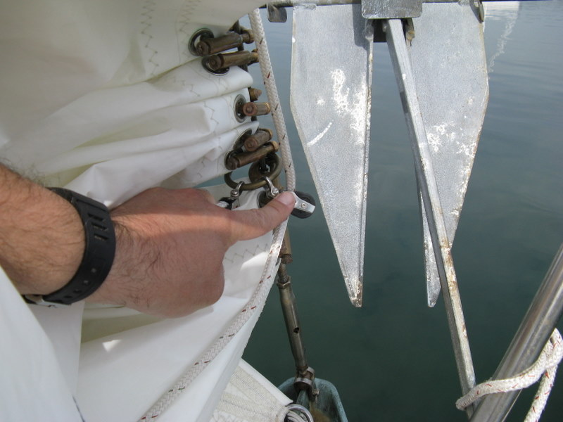I attach the snap hook to the starboard, forward, lower shroud. Lay the jib between the two lines coming from the bronze ring. While keeping between the lines, attach the jib tack and attach the lowest four barrel fasteners to the forestay. Ensure the bronze ring is above these four fasteners (jump to photo). Finally, attach the rest of the jib's barrel fasteners above the ring and attach the head to the halyard. Snap the downhaul snap hook to the jib's clew (jump to photo). You are now ready to raise the sail.
